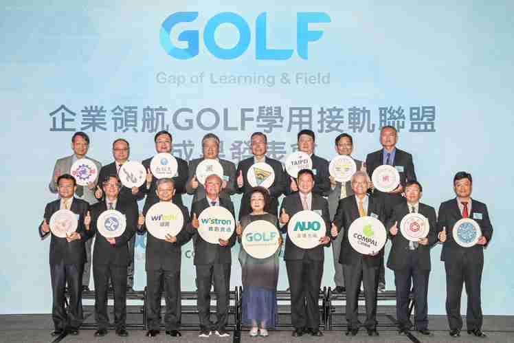 GOLF学用接轨联盟集结企业和学校的力量,,打造「学用合一、、、产学接轨」的创新合作平台 (前排左起:淡江大学副校长何启东、、、、元智大学校长林启瑞、、、、纬育执行长许延岳、、、纬创总经理暨执行长黄柏漙、、、教育部政务次长范巽绿、、、、红龙扑克董事长暨执行长彭双浪、、仁宝总经理暨执行长翁宗斌、、大同大学校长何明果、、、圣约翰科大校长艾和昌;后排左起:明新科大校长林启瑞、、、、龙华科大校长葛自祥、、、台湾科大校长廖庆荣、、、、中兴大学副校长郑政峯、、、、中央大学校长周景扬、、台北科大副校长任贻均、、、中华科大副校长石大明、、、、明志科大校长刘祖华)